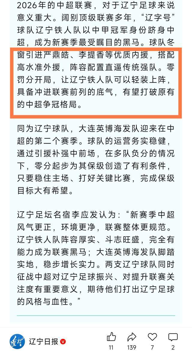 第一个,明确了辽宁2支中超球队新赛季的目标,说辽宁铁人新赛季阵容配置直逼传统强队,加上零罚分开局,有望打破原有的中超争冠格局。而大连英博零罚分起步,只要稳住主场打好关键比赛,完成保级目标大有希望。也就是说,辽宁官媒直接定调了,一个是争冠,一个是保级。