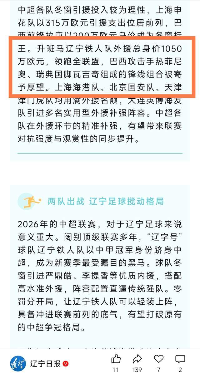 第二个,这篇文章还提到了一个细节,那就是介绍今年中超的争冠格局是群雄逐鹿,专门提到了5支球队名字,分别是海港、泰山、国安、成都蓉城和辽宁铁人,再次认可了辽宁铁人的争冠可能性。